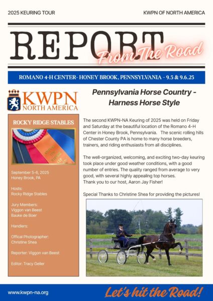 were presented. Las Vegas, Secret, Bordeaux, Ferguson, Jameson RS2, Glamourdale, Lantanas, Kjento and Le Formidable all had more than one son selected for the Performance test. One of the selected stallions was a son of Bloomberg, the only son that was presented this year. This stallion is actually owned by KWPN-NA breeder and member Scot Tolman of Shooting Star Farm.