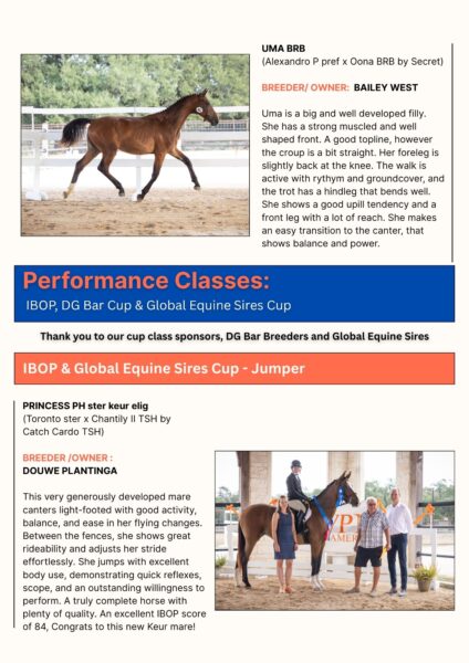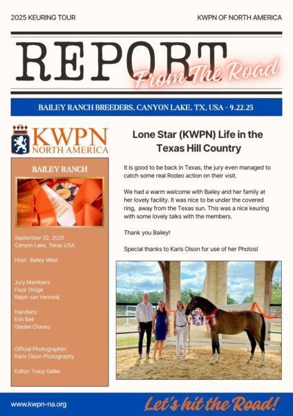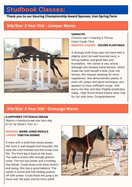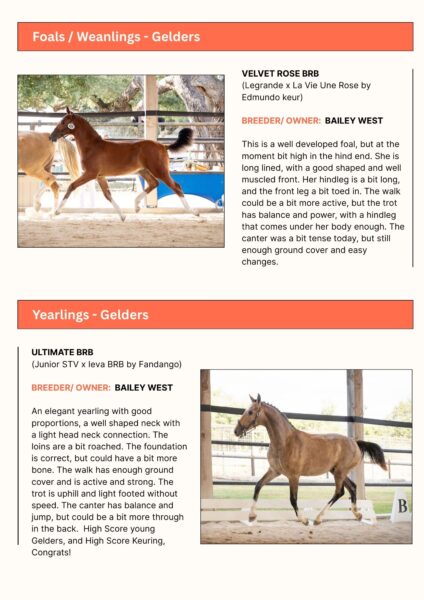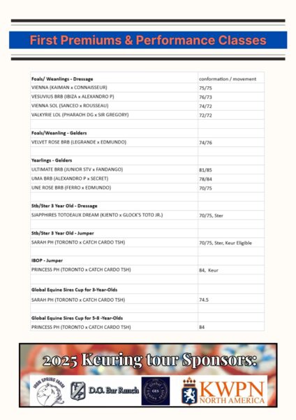 Please note that the judges only send us a write up on horses that stood out to them at a keuring. These reports hold all the first premiums and performance class results. For the other keuring results, you will be able to find them for each participating horse in their database page. Thank you Tracy Geller for creating these beautifully designed Reports with the judge’s information.