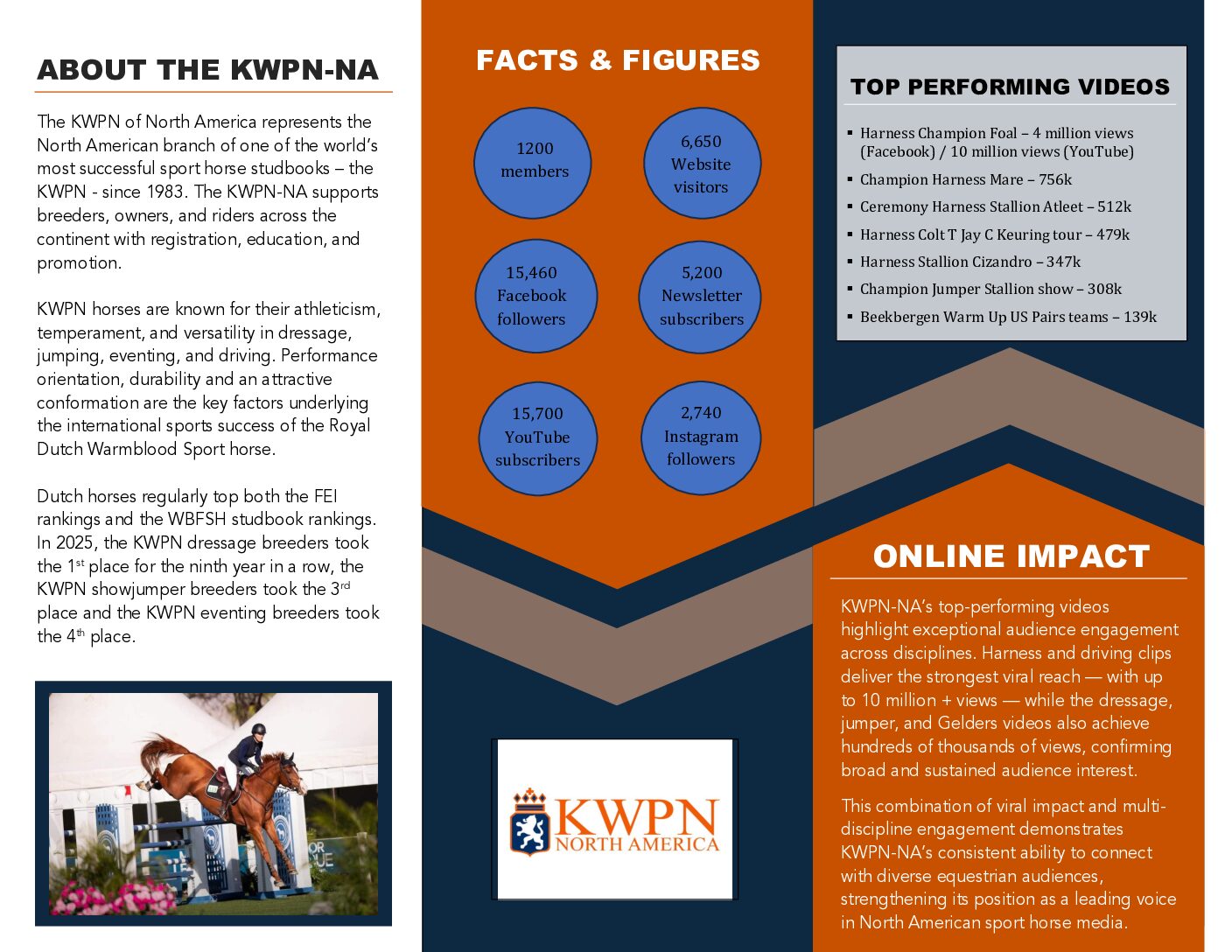 Sponsoring the KWPN-NA means getting advertising in return. We offer a broad spectrum of advertising opportunities, reaching thousands of equestrians, breeders and enthusiasts on a daily basis through all our channels. We have a large following through our newsletter and website and have exceptionally high engagement on our social media. Especially our videos and reels get thousands of views per week by educated, active, motivated horse owners and breeders from North America and beyond. Our e-newsletter has more than 5000 subscribers and the opening rate is always over 50%.