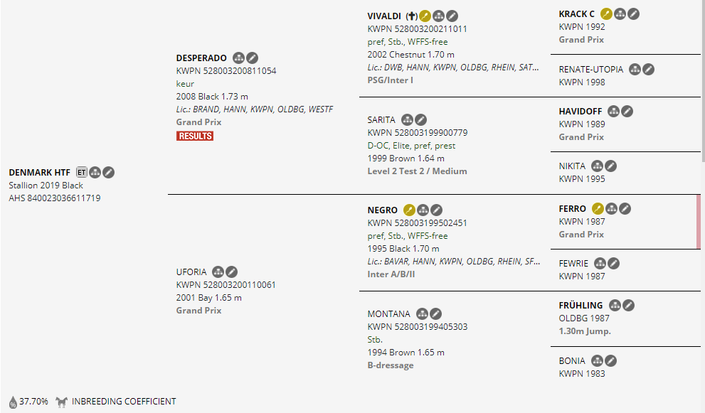 Denmark’s sire Desperado was successful from the FEI Young Horse tests to Grand Prix CDIs with scores as high as 85%. Desperado has made a significant mark as a sire, with many approved sons and multiple FEI competitors to his credit. Denmark’s dam Uforia was a successful Grand Prix horse and an exceptional producer including the approved stallion Louisville, a Premium daughter, and her oldest offspring is winning at the FEI levels. Damsire Negro is one of the most proven sires for his record of Grand Prix offspring.